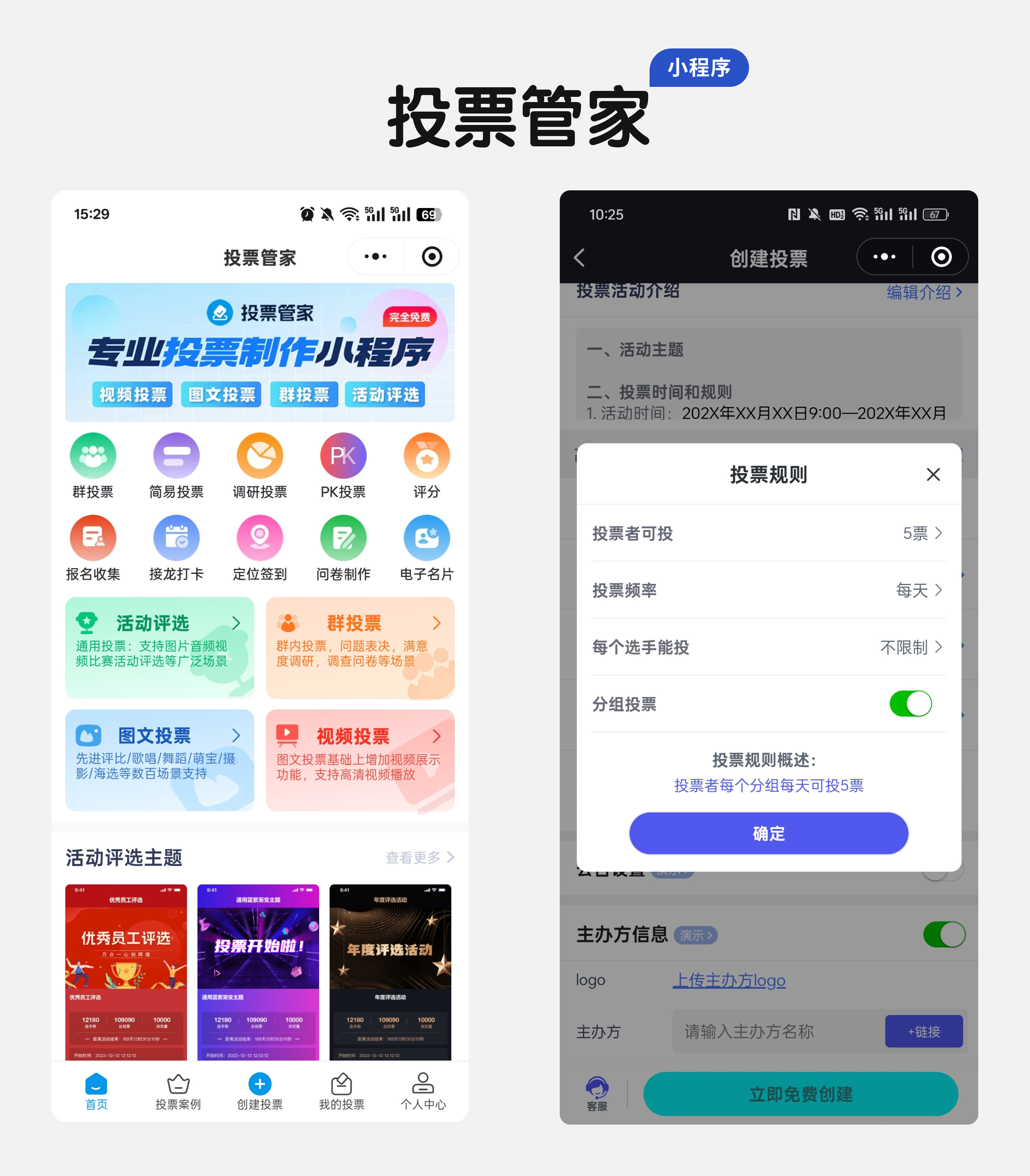 打开微信搜索“投票管家”,进入小程序后点击“创建投票”,选择“活动评选”模板。
