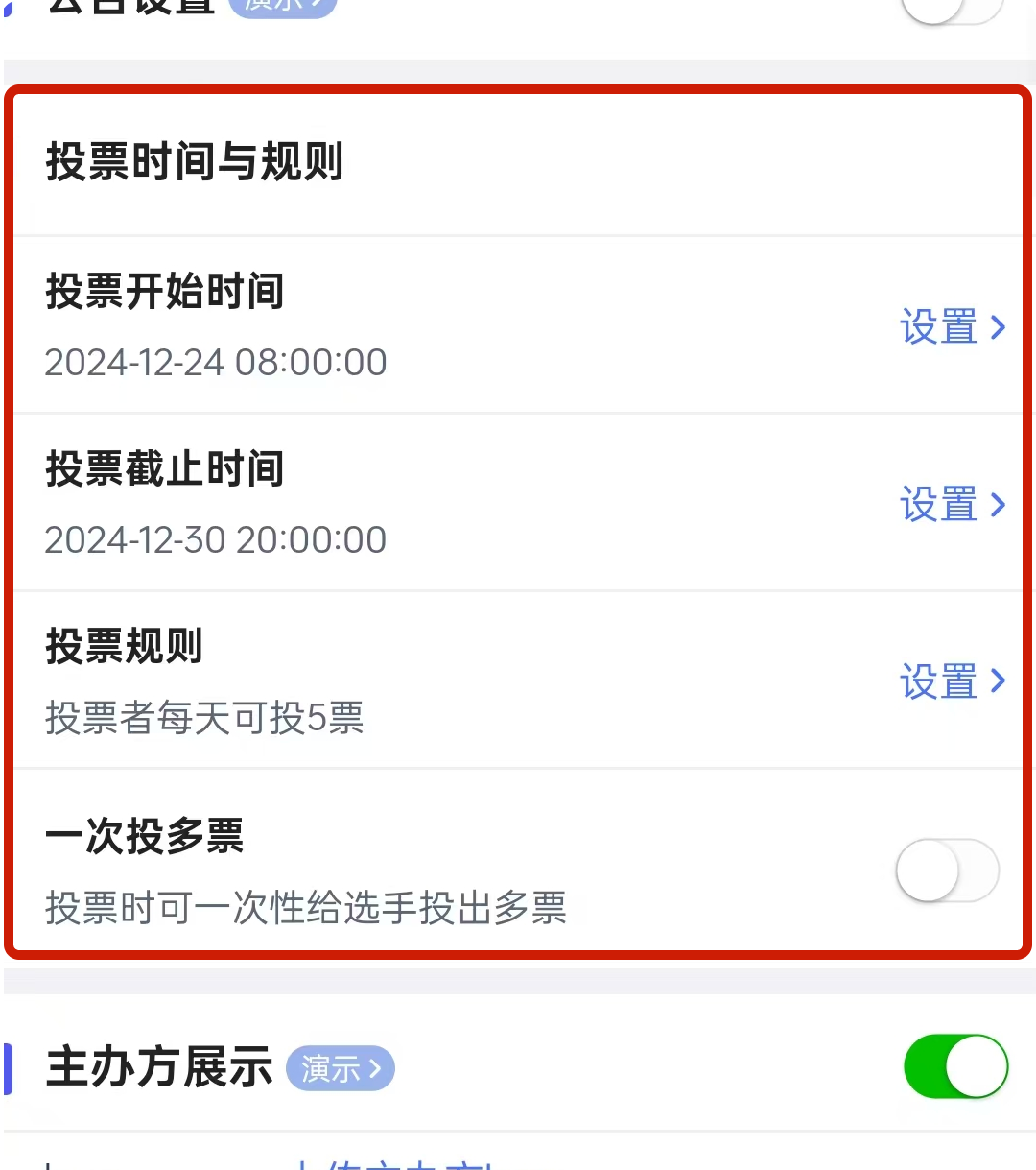 填写活动名称,设置投票时间和规则,如每个用户每天可以投多少票等。