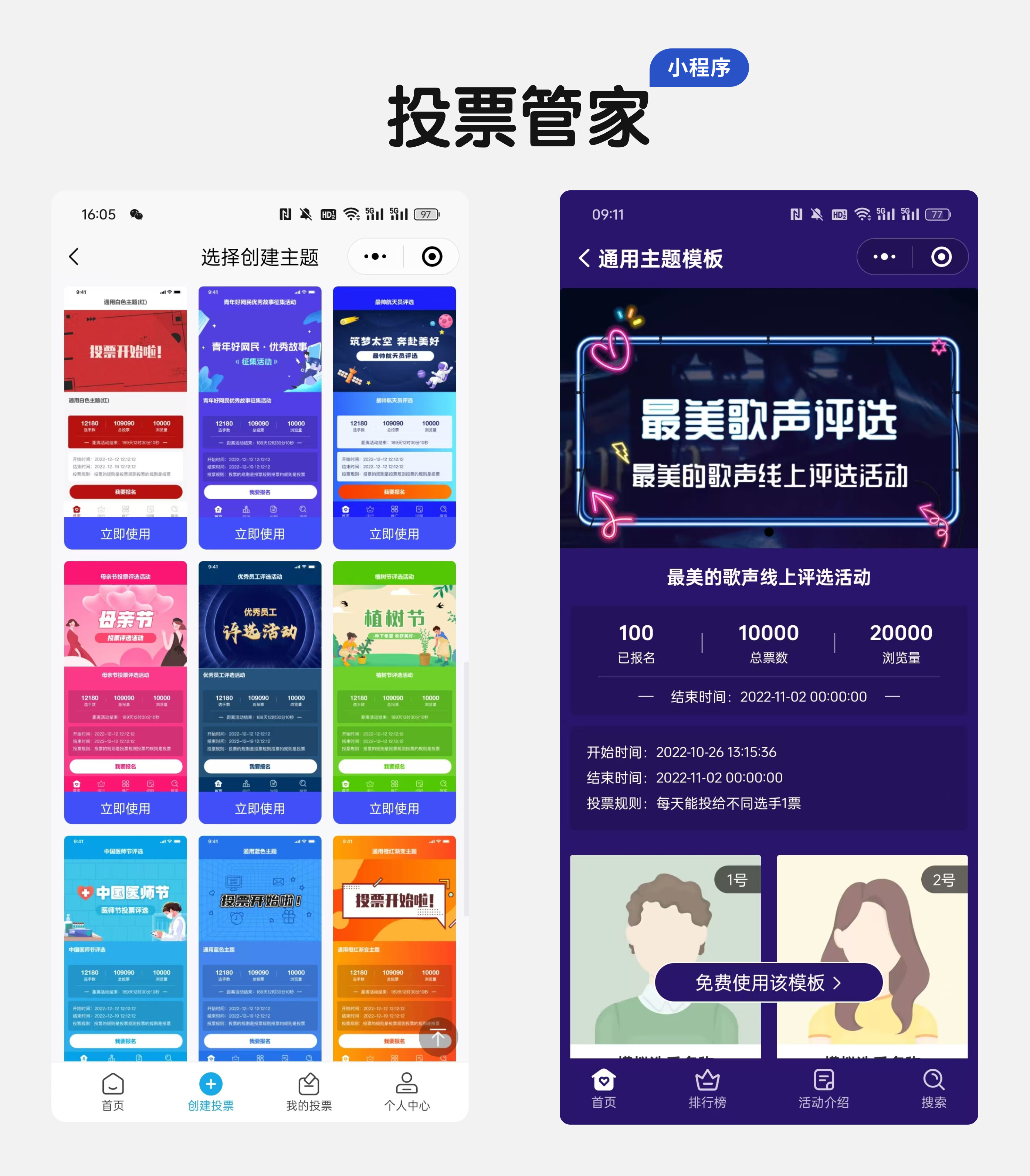 进入投票管家小程序主页,挑选适合最美好声音评选活动的投票模板,编辑投票活动的开始时间、结束时间、设置投票规则等。点击创建就可以了。