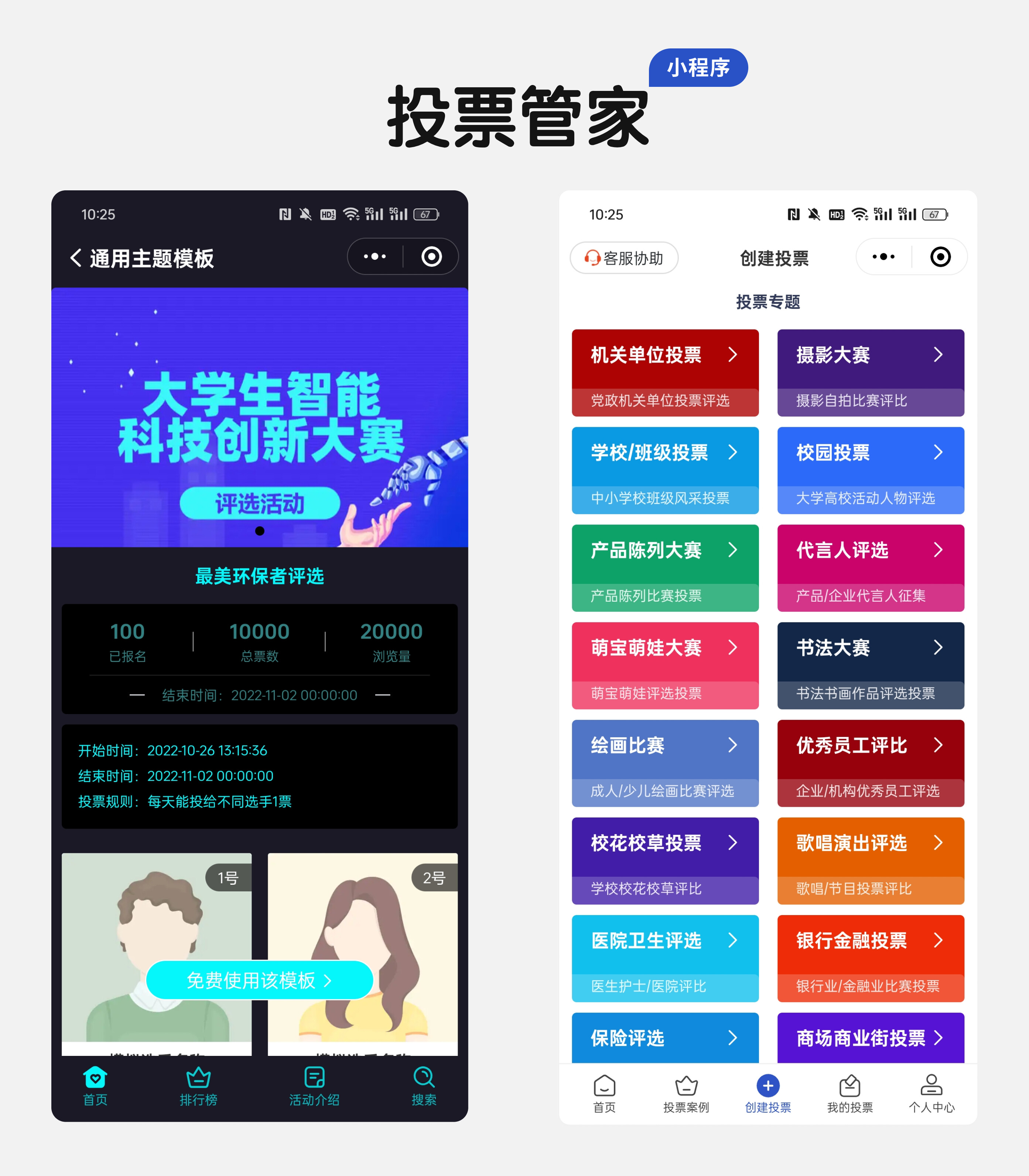 打开「投票管家小程序」后,点击 “立即创建”,选择适合城市之星评选活动的模板(直接套用更高效),然后填写核心信息:
