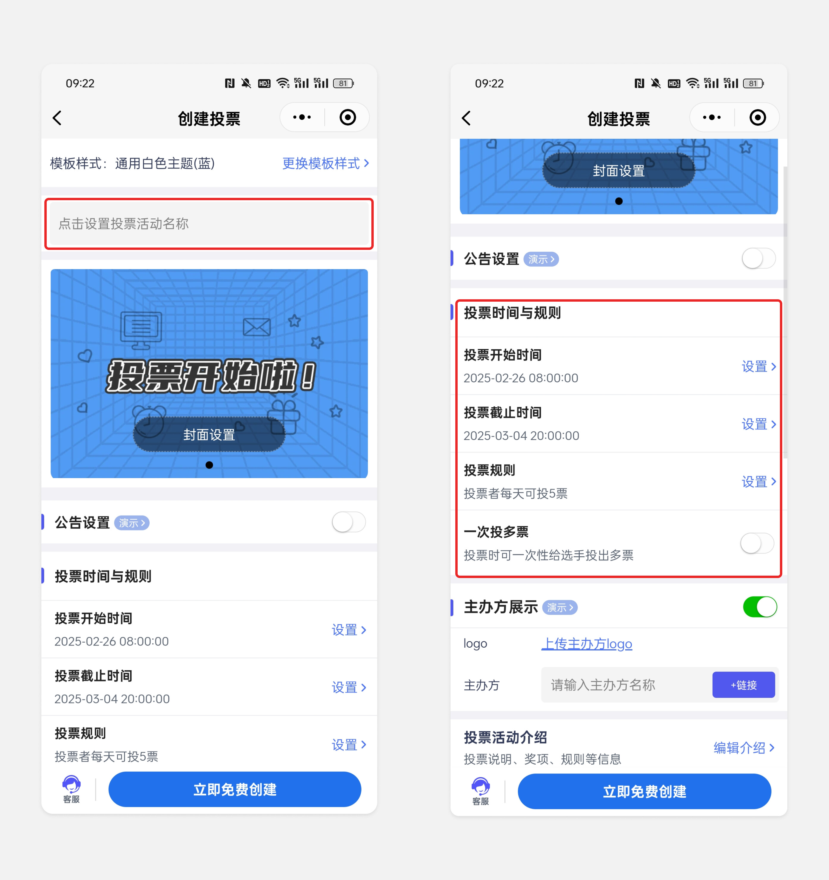3、在活动设置方面,投票管家小程序更是贴心地提供了丰富的选项。你可以根据实际需求,选择是否开启报名功能,如果希望让更多志愿者有机会参与评选,就开启报名通道,并设置好报名时间和所需信息;要是已经有确定的候选人名单,也可以直接上传候选人信息。同时,还能对投票规则进行个性化设置,比如每人每天可投的票数、是否允许重复投票等,保证评选的公平公正。
