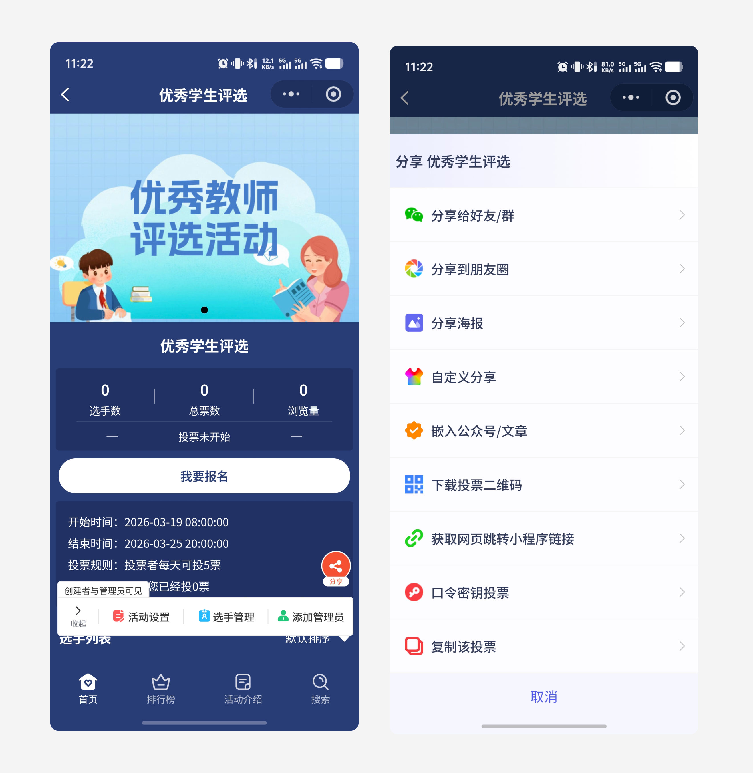 报名方式:开启【自主报名】,让参赛者自行上传作品(需审核);或由主办方统一上传;