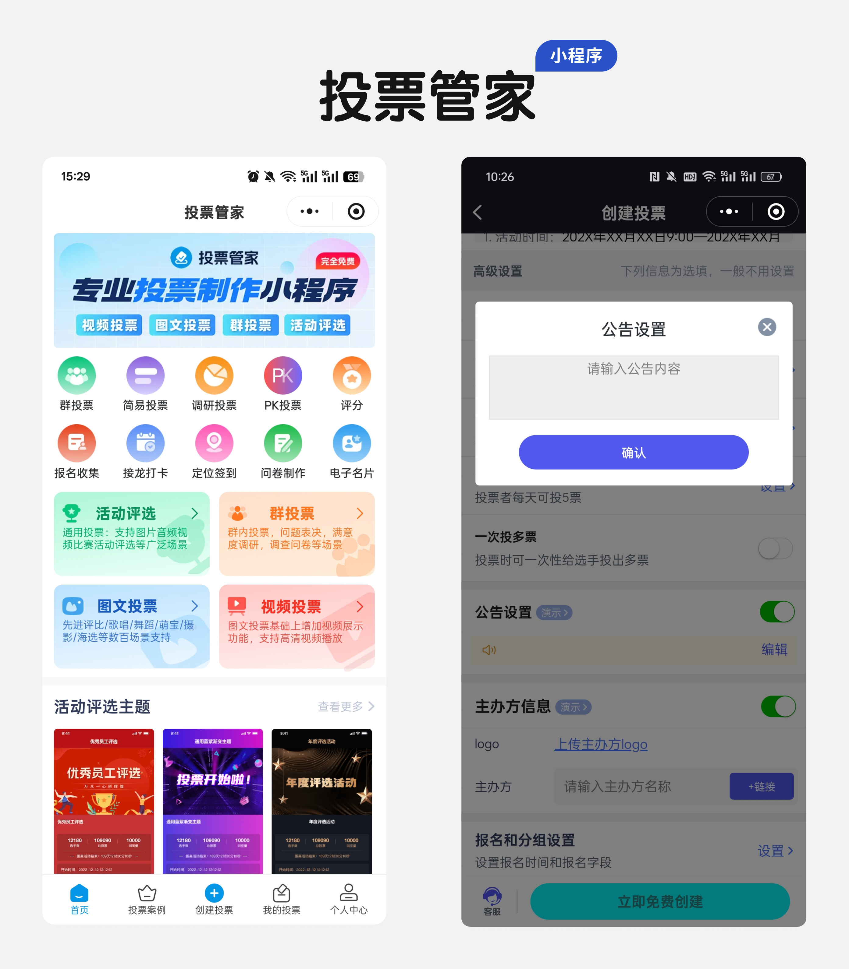 搜索小程序:投票管家,进入小程序后,点击“创建投票”,根据活动类型选择模板: