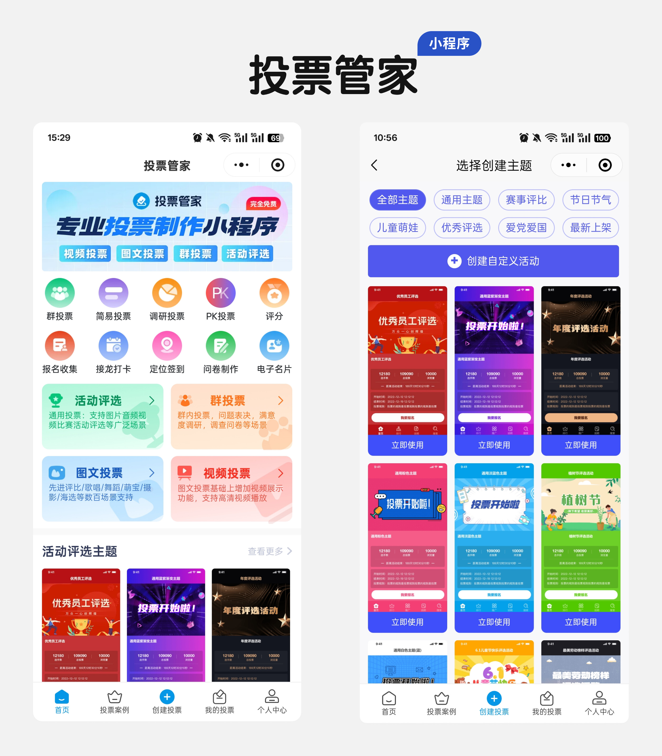 进入小程序后,点击首页 “创建投票”,在模板库中选择 “图文投票”,直接套用 “优秀员工 / 最美人物” 模板,稍作修改就能适配优秀护士评选场景,省去从零搭建的麻烦。
