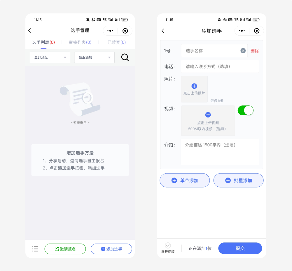 批量上传作品:点击 “添加选手 / 作品”,逐一上传摄影作品高清图,填写作品名称、作者信息、作品简介,支持单图、组图展示,作品多的话可分组管理,方便查看。